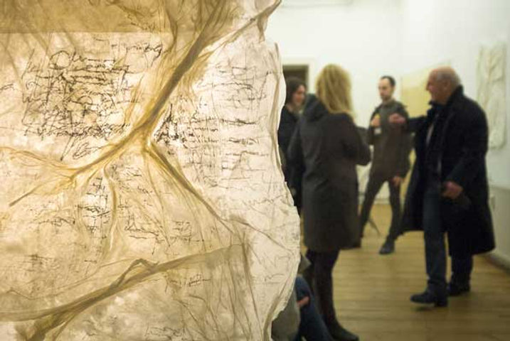 In the series “Works on Paper”, she focuses on the materiality of paper and the physical gesture of handwriting. Pevere abandons the picture frame, the body of these works made of stratified layers of archival paper, a kind of especially permanent and durable paper. The surface of the works is eroded, and layers of handwriting overlap each other, merging with the layers of paper. The handwriting is not meant to be readable: just as she discarded the frame, she discards any literal meaning of the words to reveal their pure evocative power. The opening performance “Semina Aeternitatis” is the first action of a project which aims at collecting memories of strangers and storing them on Pevere’s own DNA. The artist’s body becomes a vector connecting the past (people’s memories) and the future (future readers). In this performance, the audience and herself will speculate on DNA encoding technology. During individual sessions, members